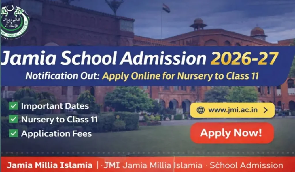 Jamia Millia Islamia (JMI) has officially released the Jamia School Admission 2026-27 Notification for its school sections. The admission process will be conducted for Nursery, Preparatory, Class I, Class VI to IX, Class XI (Science, Arts & Commerce) and Balak Mata Centres.