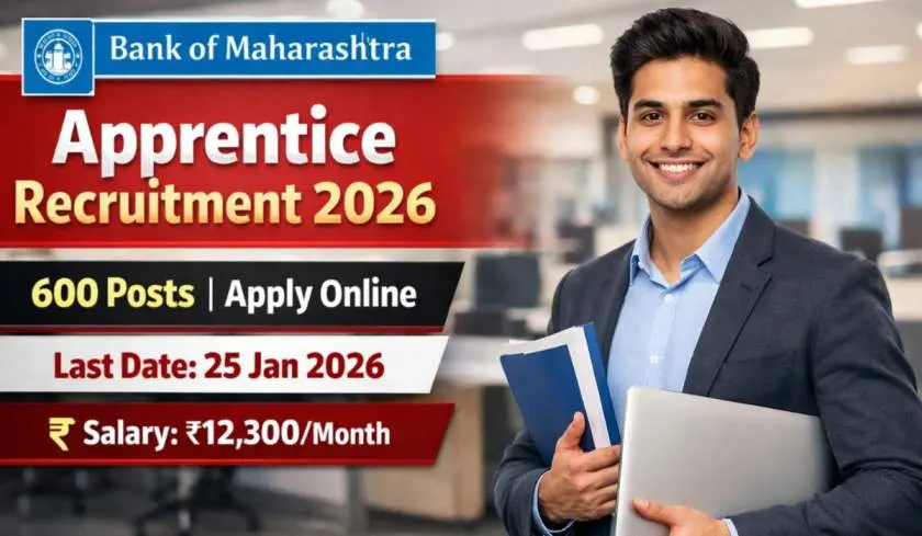 Bank of Maharashtra (BOM) has released the official notification for Bank of Maharashtra Apprentice Recruitment 2026. A total of 600 Apprentice vacancies are available across different states/UTs. Eligible candidates with any Bachelor’s degree can apply online from 15 January 2026 to 25 January 2026.