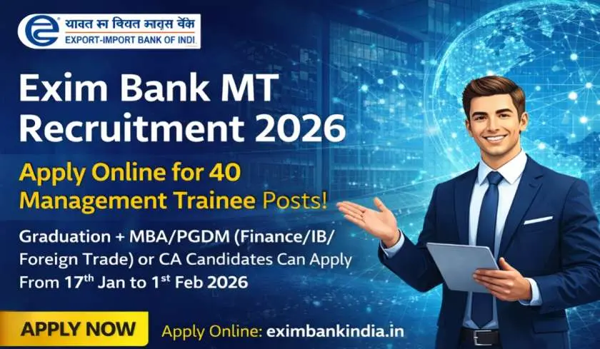Exim Bank MT Recruitment 2026 notification is out for 40 Management Trainee (Banking Operations) vacancies. Candidates with Graduation + MBA/PGDM (Finance/IB/Foreign Trade) or CA qualification can apply online from 17 January 2026 to 01 February 2026 through the official website.