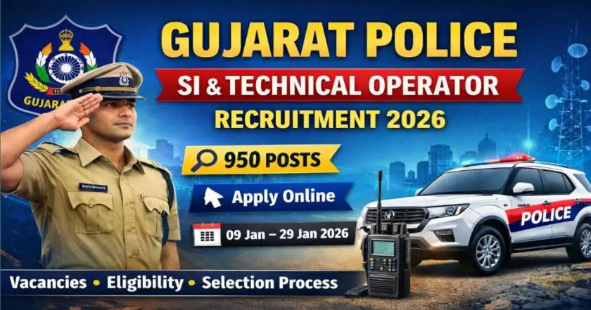 Gujarat Police Recruitment Board (GPRB) has released the Gujarat Police SI & Technical Operator Recruitment 2026 notification for 950 posts including PSI, Technical Operator, and Driver Mechanic. Eligible candidates can apply online from 09 January to 29 January 2026 through the OJAS Gujarat website. Check vacancy details, eligibility, salary, selection process, and direct apply link here.