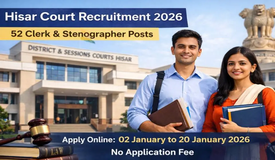 Hisar Court Recruitment 2026 notification has been officially released by the District and Sessions Judge, Hisar (Haryana) for the recruitment of Clerk and Stenographer posts. A total of 52 vacancies are available under this recruitment drive. Eligible candidates can submit their applications from 02 January 2026 to 20 January 2026.