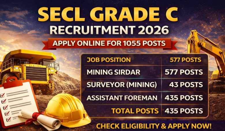 The SECL Grade C Recruitment 2026 has been officially released by . Under the SECL Grade C Recruitment 2026, a total of 1055 vacancies are available for Mining Sirdar, Surveyor, and Assistant Foreman posts.